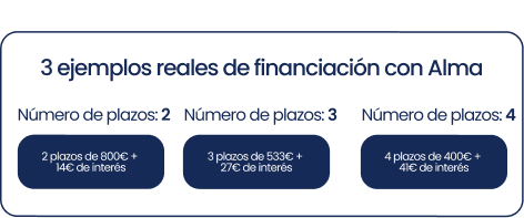 - Financiación con Alma: Si prefieres financiar, trabajamos con Alma, una plataforma que permite pagar en 2, 3 o 4 plazos, con intereses muy bajos y lo más cómodo: sin bancos, sin papeleos ni burocracia.