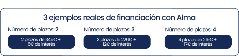 - Financiación con Alma: Si prefieres financiar, trabajamos con Alma, una plataforma que permite pagar en 2, 3 o 4 plazos, con intereses muy bajos y lo más cómodo: sin bancos, sin papeleos ni burocracia.