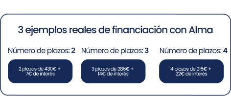 2. Financiación con Alma: Si prefieres financiar, trabajamos con Alma, una plataforma que permite pagar en 2, 3 o 4 plazos, con intereses muy bajos y lo más cómodo: sin bancos, sin papeleos ni burocracia.